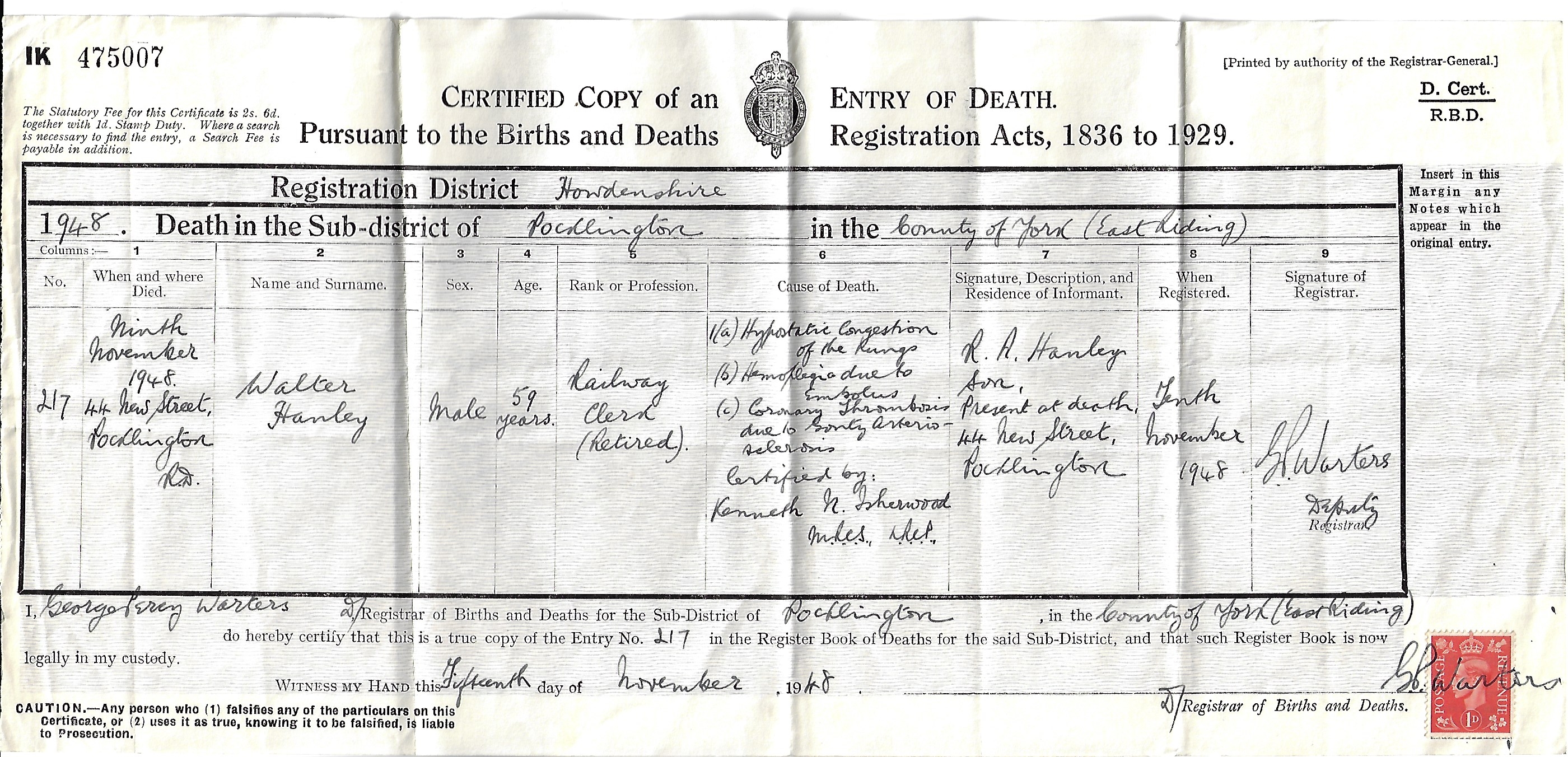 Marriage Certificate of Walter Hanley(1889)and Florence Walker.